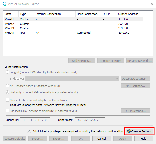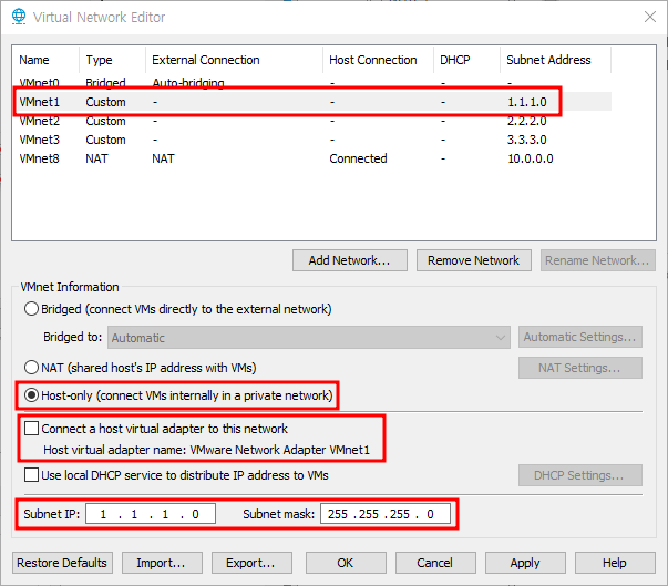 - VMnet1 - 1.1.1.0 (HostOnly, 호스트 PC 연결 X)