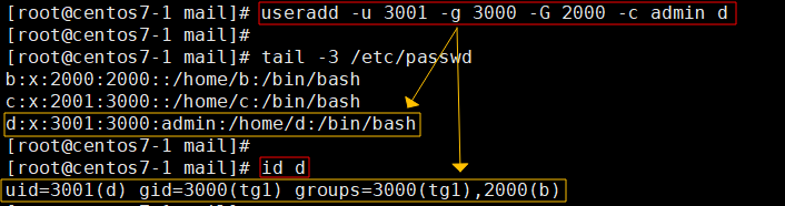※ d 계정 생성. uid는 3001, gid는 3000, 추가그룹 2000, 코멘트 admin