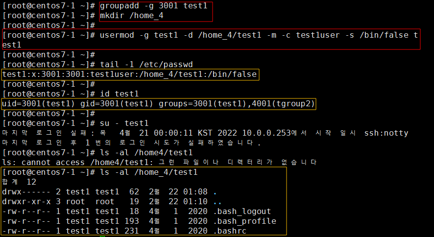 [문제2] 사용자 test1의 그룹을 3001(test1), 홈디렉토리는 /home_4/test1로 변경하며 컨텐츠도 모두 이동,