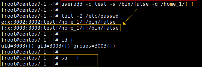 ※ f 계정 생성. 코멘트는 test, 쉘은 로그인 불가로 설정하며 메세지는 출력하지 않음. 홈디렉토리는 /home_1 아래에 생성