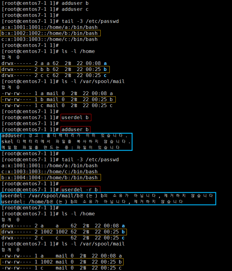 - uid가 달라서 홈디렉토리와 메일파일이 삭제되지 않는다.