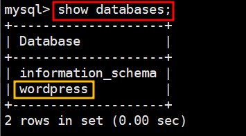 → show database 쿼리문 실행 시 wordpress DB가 보이면 권한이 부여 된 것. 권한이 없을 경우 해당 DB가 출력되지 않는다.