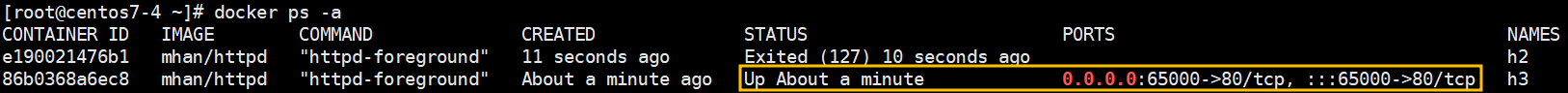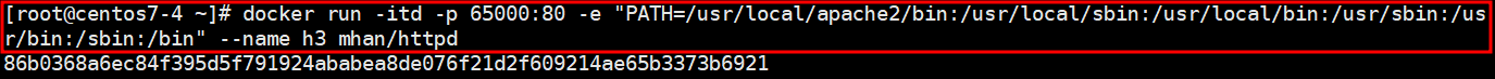# docker run -itd -p 65000:80 -e "PATH=/usr/local/apache2/bin:/usr/local/sbin:/usr/local/bin:/usr/sbin:/usr/bin:/sbin:/bin" --name h3 mhan/httpd
